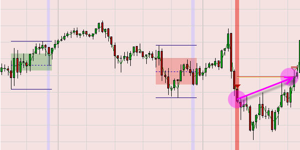 Le premier jour, le marché clôture dans la moitié inférieure de la fourchette de négociation. Le deuxième jour, le marché clôture dans la moitié supérieure de la fourchette de négociation. Au début du troisième jour, une position longue a été ouverte lorsque le prix s'est déplacé d'un tick au-dessus du plus haut du deuxième jour (ligne verticale verte).