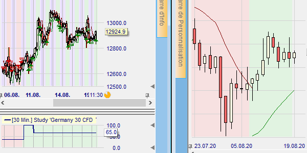 Une fois les deux études créées, il suffit d’importer l’étude 2 dans l’étude 1. Cela a deux conséquences. Premièrement, le fond d’écran du graphique de l’étude 1 se colore en vert si la tendance est haussière et en rouge si la tendance est baissière. Deuxièmement, l’étude 1 n’affichera et n’exécutera que les signaux orientés dans la direction de la tendance définie par l’étude 2. Ci-dessous, on peut voir à droite, le graphique journalier de l’étude 2 qui montre le Dax en tendance haussière, et à gauche, le graphique 30mn avec un fond vert an ligne avec la tendance haussière récente.