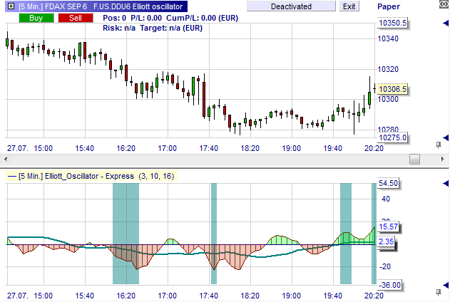 Une des particularités de l’oscillateur d'Elliot est qu’il cherche un consensus entre le nouveau haut/bas de l’oscillateur et le prix. S’il y a un nouveau haut/bas aussi bien dans l’oscillateur (sur 20 périodes) que dans le prix (sur 40 périodes), le fond du graphique se colore en bleu. Cela met en évidence les opportunités de trading les plus intéressantes pour les traders.