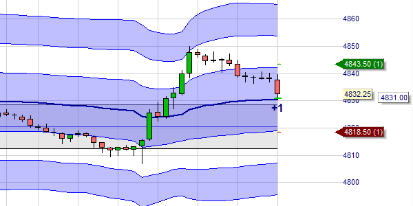 Le deuxième exemple montre une journée haussière sur le future Mini NASDAQ100. Le marché se situe au-dessus des niveaux VWAP de la veille (non visible). Sur un graphique en 5 minutes, le marché a fait un retrait vers le VWAP du jour et le trader a pris une position à l'achat, à 4831. Il a placé un stop à 4118,50. Son objectif est placé à 4843,50 juste au dessus de la première SD.